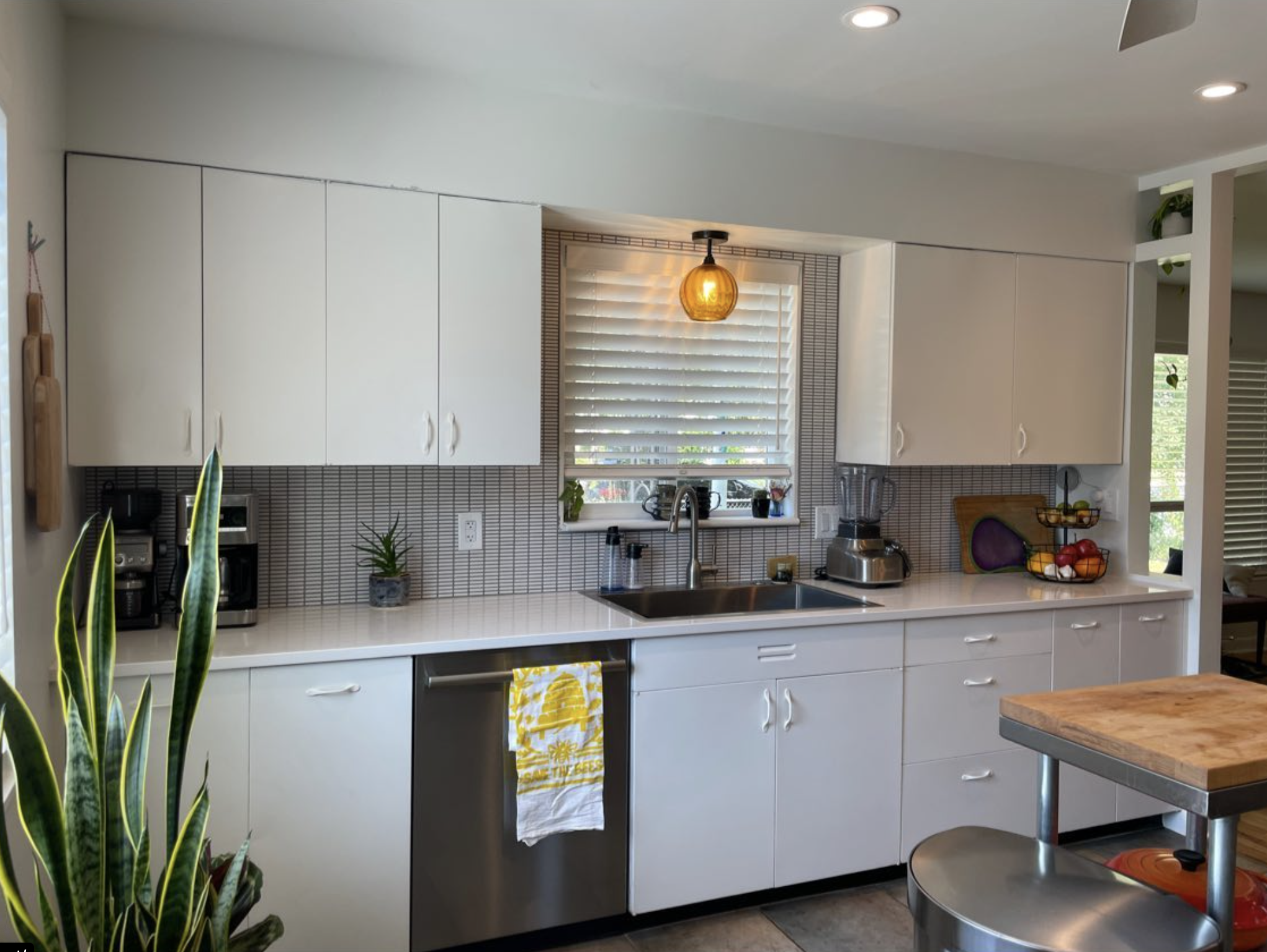 Kitchen remodel. Painted cupboards, new tile backsplash, dishwasher & disposal added, sink replacement.
